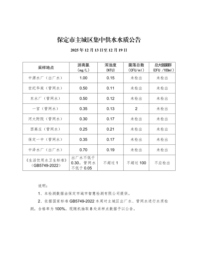 主城區(qū)集中供水水質(zhì)公告(12月13日至12月19日)