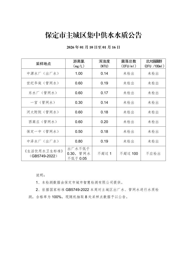 主城區(qū)集中供水水質(zhì)公告(01月10日至01月16日)